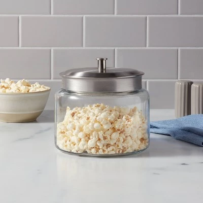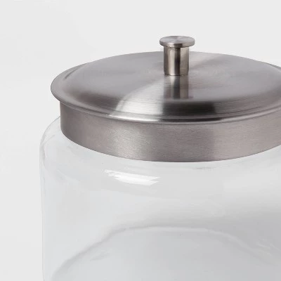 Make kitchen storage easy with this Glass Jar with Metal Lid from Thresholdâ„¢. This simple glass jar with a 64-ounce capacity is a must-have pantry or kitchen essential. It features a round see-through design for easy viewing of stored content. The practical jar makes an ideal choice for storing a variety of food items and dry ingredients that are used in your kitchen. The stainless steel lid helps to keep the items fresh inside. Plus, it can be hand washed for easy maintenance.