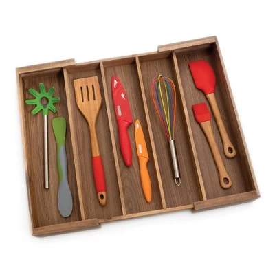 his Acacia Expandable Organizer Tray features up to 5 compartments to sort and organize your flatware, utensils, and odds and ends. Made of durable acacia that fits in beautifully with any decor. The high variation in the grain and knot pattern of acacia allows you to pair each piece with both light and dark colors in any drawer. This modern-day clutter solution is expandable to accommodate various drawer widths and utensil sizes.