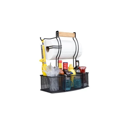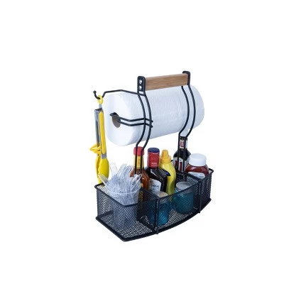 Superior Trading Co’s new caddy is a must at every BBQ or picnic, combining function and style. Easily store your paper towels, condiments, seasonings, tools and utensils. Heavy duty powder coated steel will not rust. Center mounted handle balances your items and makes for easy transportation. Hang a garbage bag on the utensil holder for extra convenience.