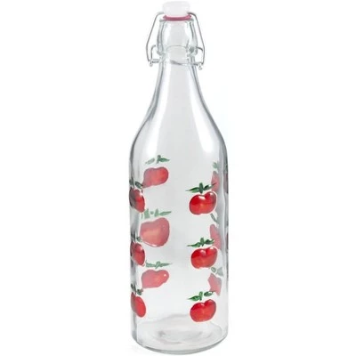 Serve apple cider juices or other beverages to your guests in style with this apple patterned bottle. It is made of durable glass and uses a swing top gasket lid. Patterned around the entire exterior are small red apples which also make the bottle easier to hold. Cute and functional this delightful serving bottle is the perfect addition to any table.