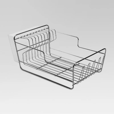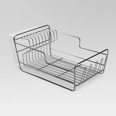 Hand-wash your dishes with ease using this Dish Rack with Utensil Tray from Threshold™. This dish rack has a detachable utensil tray and a place for holding glasses while they dry, adding convenience to your hand-washing routine. Plus, with integrated handles and a metal design with a matte nickel finish, this dish rack adds a touch of sleek style to your kitchen.