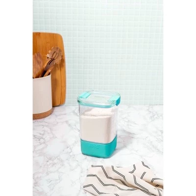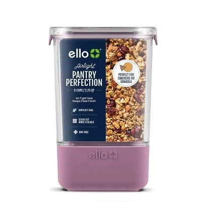 Get organized with Ello 9 Cup Food Storage Canister. This canister is designed to stay put when stacked due to its protective silicone boot and modular design. The airtight lid locks food in to keep it fresh, so it’s perfect for storing dry goods like bulk foods and baking ingredients. Keep any cupboard organized with this space-efficient design, and scoop and pour with ease due to its wide opening and round corners. Hand wash recommended. For dry goods only. Do not microwave. Canisters are safe for fridge and freezer use.