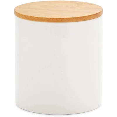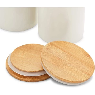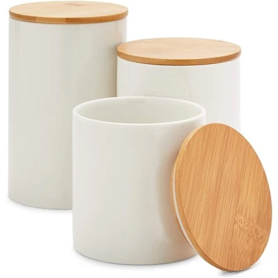 Item DescriptionThis 3-piece white ceramic canister set is ideal for storing dry foods while simultaneously sprucing up your kitchen decor. The airtight bamboo lids will ensure beans, rice, pasta, coffee, and tea leaves will stay fresh and secure. The kitchen canisters come in 3 assorted sizes that can easily be stored in the kitchen cabinet or countertop. Farmlyn Creek takes a fresh approach to contemporary rustic home living products. Our team of designers strives to ensure anyone can personalize their home with coziness and comfort on a budget, without compromising quality.Product names are trademark of listed manufacturer or other owners, and are not trademarks of eForCity Corp. The manufacturer does not necessarily endorse use of these products.