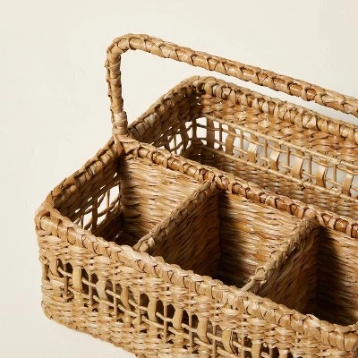 Keep your flatware organized while adding a decorative touch to your kitchen counter or dining table with this Natural Woven Caddy from Hearth & Handβ’ with Magnolia. Showcasing a beautifully woven pattern, this caddy creates an elegant display on the table or kitchen counter. The divided, multiple compartments help keep the flatware separate and organized in one spot. And with the built-in handle, you can easily move this natural flatware caddy from the kitchen to the dining table and vice versa.