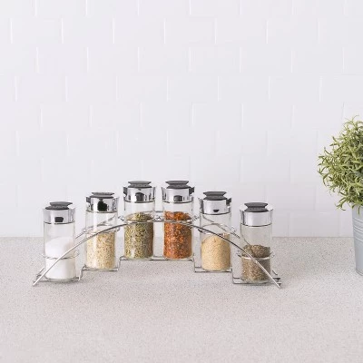 Keep your favorite herbs and seasonings close at hand using our ultra, sleek half-moon steel spice rack set. The narrow profile fits neatly near the stovetop or the kitchen table so its always within reach for every meal. Spices, herbs, and seasonings not included. Complete with 6 empty jars, load it up with your most frequently uses flavors or your go-to gourmet staples. *Please note: Slight variation in size and color is expected from piece to piece as they are all handmade, but that is what makes them one-of-a-kind. *