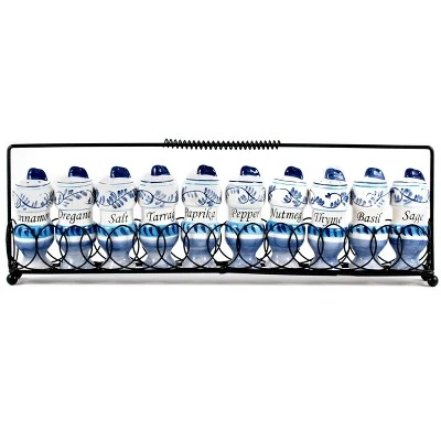The Amalfi Coast collection embodies the classic feel of the Italian coastline. This set is sure to add style to your kitchen. The black spice rack comes with ten blue and white labeled spice jars. The jars are individually labeled as pepper tarragon salt cinnamon nutmeg paprika oregano thyme basil and sage. With timeless style and fresh design this collection will be sure to find a place in your home.