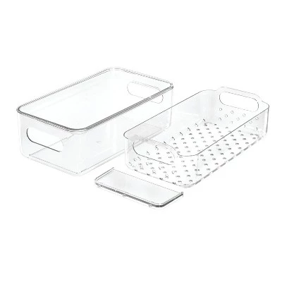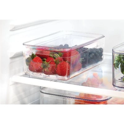 Keep your food protected and organized with the iDesign Berry Holder! This unique container perfectly holds a container of strawberries and features an integrated hole and ledge for easy transportation. The organizer is made of durable, BPA-free plastic for the highest-quality construction. Easily rinse your berries in the basket with the slotted-bottom design – water drains out quickly and keeps your fruit fresh and clean in your fridge. When it comes to clean-up, the holder is easy to clean – just remove the inner basket and hand wash with mild detergent and water.