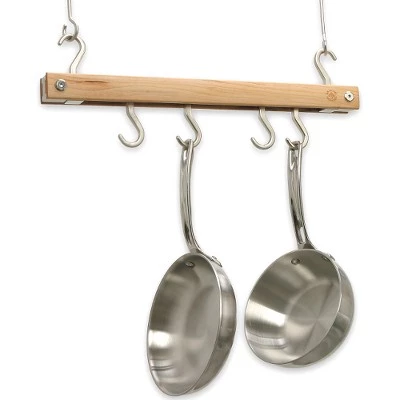 J.K. Adams ingeniously simple bar pot rack was designed for smaller kitchens apartments and modestly sized cookware collections. Pans are securely hung on cast metal pot hooks that rest between wooden rails. Hooks can be turned to show pans face-out or sideways like books on a shelf. The suspension hardware positions the rack at a convenient height from an 8 foot ceiling. J.K. Adams has been the leader in producing fine quality wood products for over 60 years in its Dorset Vermont factory. Using the best wood in New England as a commitment to outstanding product quality they selectively harvest hardwoods from replenished and managed forests.