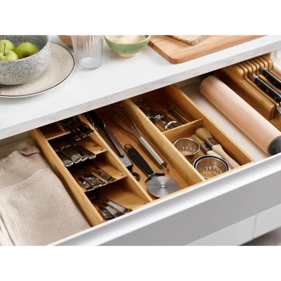 Organize messy utensil and cutlery drawers with this practical and smart storage solution. This unique tray combines five overlapping compartments for storing cutlery with three deep-sided compartments for holding utensils and gadgets. What’s usually stored in two drawers can now be neatly Organized into one, creating more space in your kitchen. Made from beautiful, natural bamboo. Wipe clean with a damp cloth and dry by hand (do not soak). Oil regularly with a food-safe oil to maintain best condition. Suitable for drawers with a minimum height of 8 cm (3¼ inches).