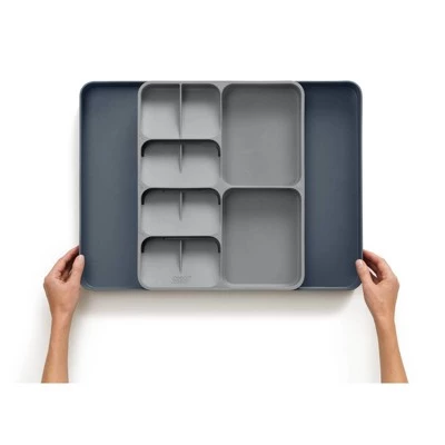 Organize messy cutlery and utensil drawers with this highly practical storage solution. The unique design features five overlapping compartments for storing cutlery and two deep-sided compartments for holding gadgets. Both sides of the tray can then be expanded either side to create even more storage space for larger utensils and also to fit your drawer perfectly. Whatβs usually stored in two drawers can now be neatly Organized into one, creating more space in your kitchen. Wash and dry by hand.