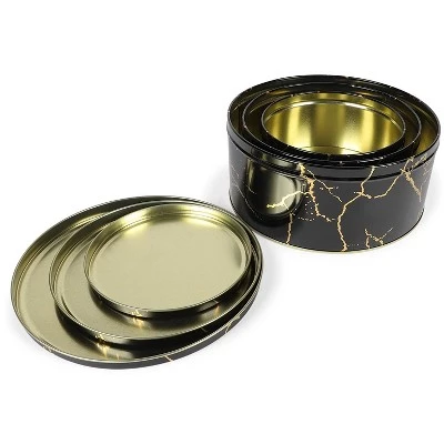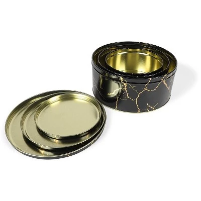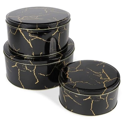 Item DescriptionJuvale Black Marble Metal Tins with Lids, Kitchen Canisters (3 Sizes)COOKIE TINS WITH LIDS: Conveniently package desserts and sweet treats such as cookies, nuts, chocolate, cupcakes, and candiesNESTING STORAGE BINS: These decorative cookie tins can be nested in each other to save space when not in use; use to store arts and craft supplies or small items around the houseDIMENSIONS: Round tins come in 3 assorted sizes: large: 7.8 x 7.8 x 3.5 inches; medium: 6.7 x 6.7 x 3.2 inches; small: 5.5 x 5.5 x 2.9 inchesWHATโS INCLUDED: Includes 3 black marble and gold foil tin cookie containers with lidsUse these cookie tins with lids for gift giving during the holidays for Christmas. The round tin can also be used to hold small knick-knacks, jewelry, or arts and crafts supplies, and can easily be stored in one another when not in use.Product names are trademark of listed manufacturer or other owners, and are not trademarks of eForCity Corp. The manufacturer does not necessarily endorse use of these products.