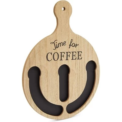 Add this wall-mounted coffee pod organizer to your kitchen to elegantly display your coffee capsules. This coffee pod display is paddle-shaped and reads “time for coffee”, its versatile design is perfectly sized for coffee stations, kitchen counters, islands, dining tables, and break rooms. This wood coffee cup display measures 9.5 x 12.6 inches and is a great gift for coffee-loving friends and family members for holidays, birthdays, and anniversaries. Please note this coffee pod organizer is intended to hold small coffee capsules like espresso pods, the wide openings for placing in pods measure 1.46 inches, the coffee pod storage shoot measures 1.2 inches.Product names are trademark of listed manufacturer or other owners, and are not trademarks of eForCity Corp. The manufacturer does not necessarily endorse use of these products.
