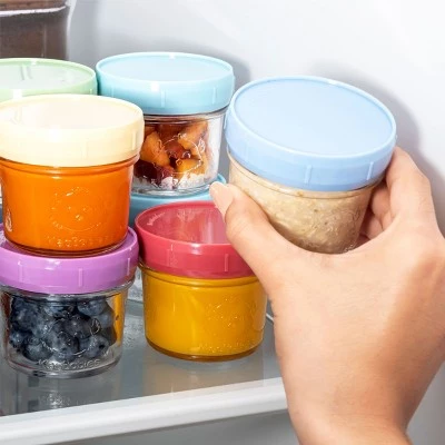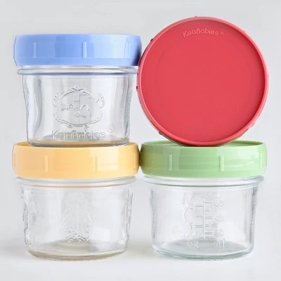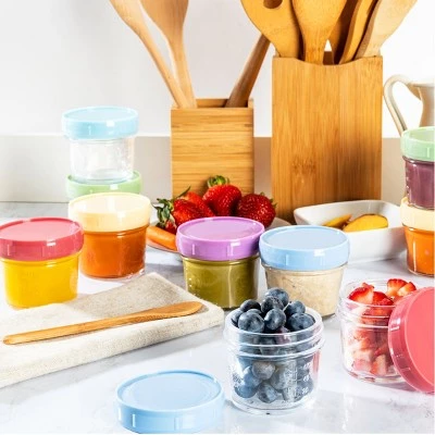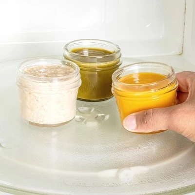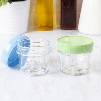 - Set of 12; durable and stackable 4 oz food-grade baby glass containers