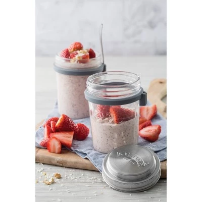 The Kilner 11.8 fl oz Breakfast Jar Set is a unique way to store and consume breakfast snacks like overnight oats and cereals whether at home or on the go. Included in the set is a Kilner® 11.8 fl oz Wide Mouth Jar which comes with a unique stainless steel lid that doubles as a measuring cup for better portion control. This set also includes a stainless steel spoon, silicone spoon holder and airtight sealing disc to prevent leakage when being transported. Jar is dishwasher safe, remove metal lid and spoonbeforehand. Supplied in full colored gift box.