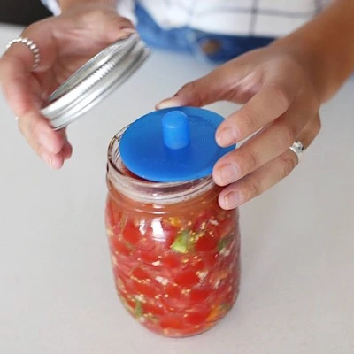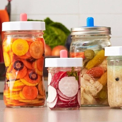 The set of wide mouth mason jar Pickle Pipes comes in four attractive colors (red, teal, purple and blue) so you can keep track of similar ferments easily. And because they’re from the mason jar accessory experts, you can be sure they are an exact fit for your jars. Trust Masontops for the best selection of mason jar tools!
