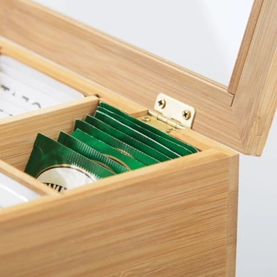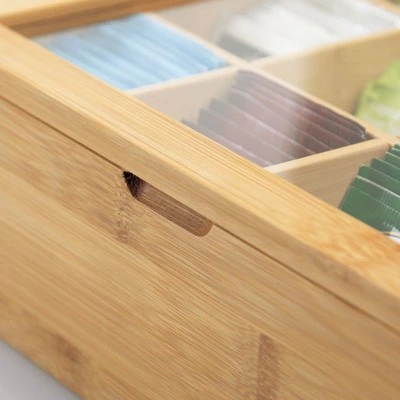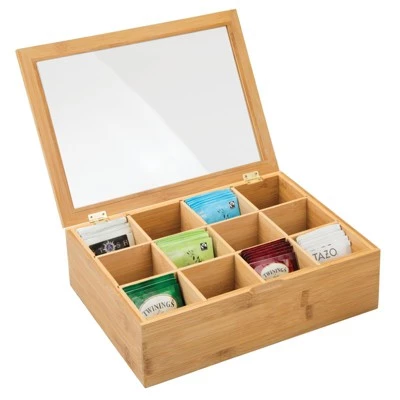Streamline and declutter kitchen spaces with the Twelve Section Bamboo Tea Storage Organizer Box from mDesign. Each organizer has twelve deep sections for storing tea bags and packets horizontally or vertically while allowing the lid to shut completely. The clear window makes it easy to see what’s stashed inside and the hinged lid opens to make grabbing whats inside simple. Perfect and compact enough for use in the kitchen cabinet, on a counter top, in the pantry or at the coffee bar.
