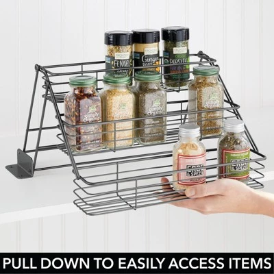 The mDesign 3 Tier Pulldown Spice Storage Rack makes the most of the storage space in your kitchen cabinets. The three-level shelf design makes it easy to see what’s stored on each level and quickly grab what you need. Each shelf keeps spices, baking supplies and more in one compact and convenient place. This smart storage solution makes everyday living a little easier.