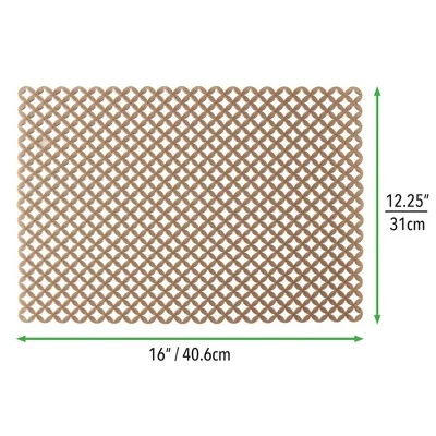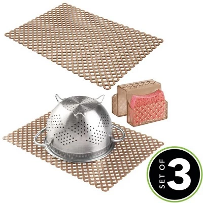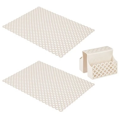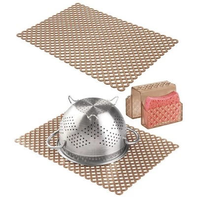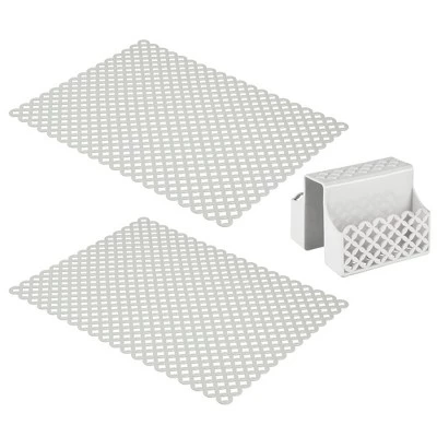Keep kitchen sinks looking brand new and scratch-free with the quick draining Kitchen Sink Dish Drying Set from mDesign. The mats keep dishes elevated off sink surfaces to avoid scratches and damage while the sink pouch offers two-sided storage for dish scrubbers and sponges. The unique cut-out design lets water flow through allowing your dishware to air dry quickly, and it keeps the water from backing up in your sink. The pattern allows you to easily cut it apart and customize it exactly to your sink’s size. Sponges and scrubbers drip dry right in the sink pouch to keep your countertops tidy and free of excess water.