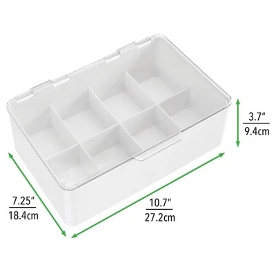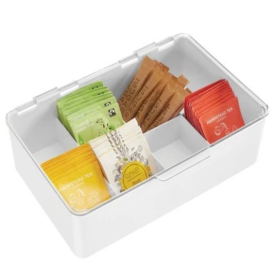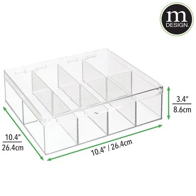 Streamline and declutter kitchen spaces with the Stackable Tea Storage Organizer Bin from mDesign. Each organizer has 8 sepearate sections to store and organize tea bags, sugar packets, sweetners, creamers, and more. A hinged lid lets the bins stack to create vertical, space-saving storage. The clear construction makes it easy to see what is stored inside. Perfect for use in the kitchen cabinet, on a counter top, in the pantry or at the coffee bar.