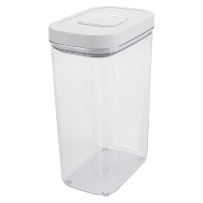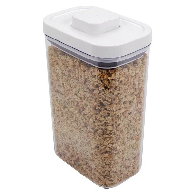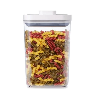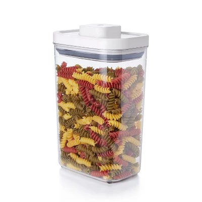 Keep dried pasta and breadsticks fresh and out of the way with the OXO SoftWorks Rectangle POP Container. The innovative lid creates an airtight seal with the push of a button. Press the button again and feel it “pop” up to double as a lid handle. A durable, BPA-free body shows exactly what’s inside the 2.7-qt Container. Rounded corners make for mess-free pouring and the lid easily comes apart for quick cleaning. Designed for modular stacking, POP Containers make the most out of any storage space.