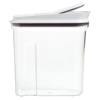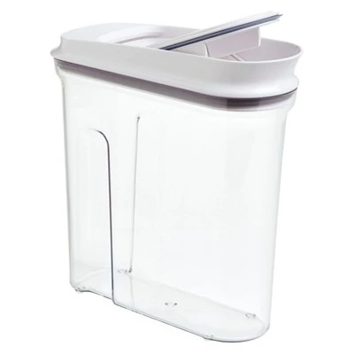 The POP Cereal Dispensers feature pop-open lids for one-handed opening and closing. The smooth-pour spout is designed to prevent messy spills. Contoured for a comfortable hold, even when full. Shaped for efficient storage on countertops or in cabinets.