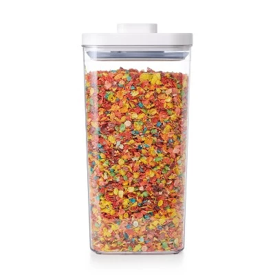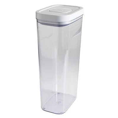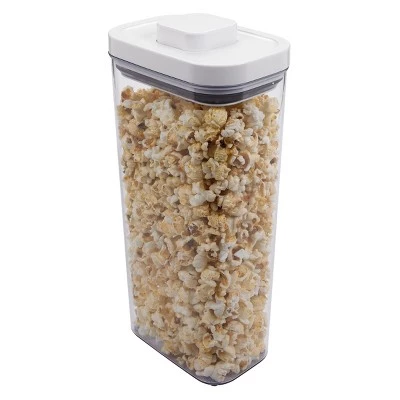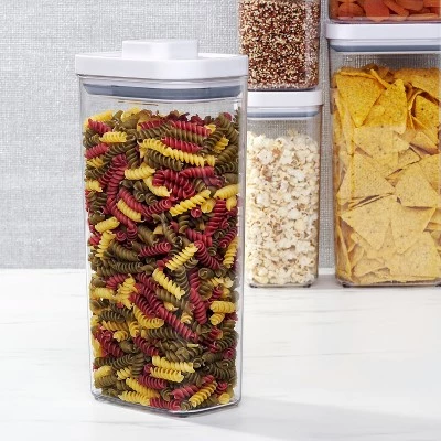 Keep cereal and dried lasagna noodles fresh and out of the way with the OXO SoftWorks Rectangle POP Container. The innovative lid creates an airtight seal with the push of a button. Press the button again and feel it “pop” up to double as a lid handle. A durable, BPA-free body shows exactly what’s inside the 3.7-qt Container. Rounded corners make for mess-free pouring and the lid easily comes apart for quick cleaning. Designed for modular stacking, POP Containers make the most out of any storage space.
