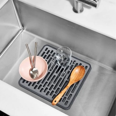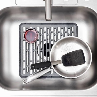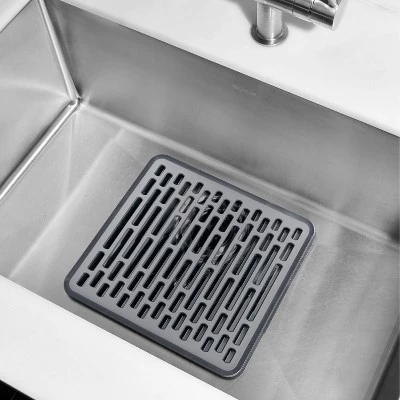 Protect your sink and dishware from scratches, chips and dents with the OXO SoftWorks Small Sink Mat. The sturdy, raised structure allows for ample air and water flow, and the non-slip feet keep the Mat elevated for quick drying. Our Mat has a soft surface to protect glassware and dishes. Dimensions: 12.25 in x 11.5 in x 0.5 in/31 cm x 29.5 cm x 1.3 cm.