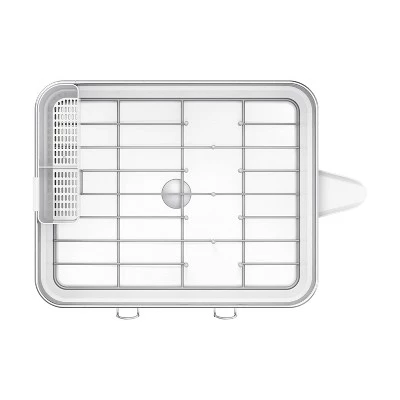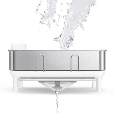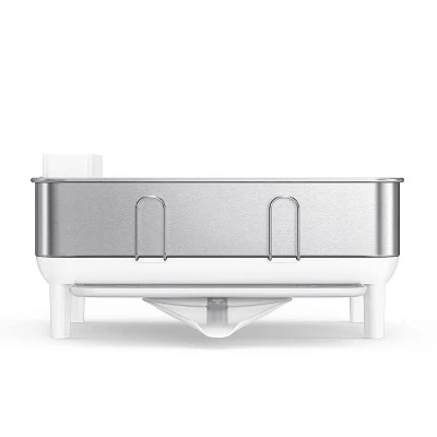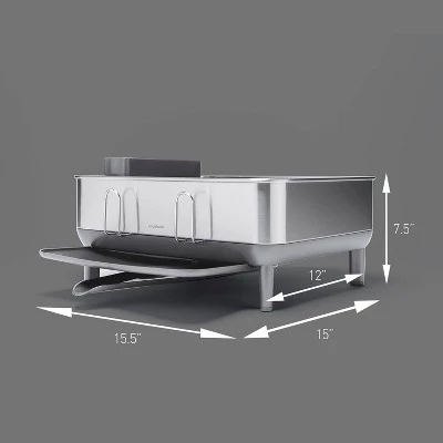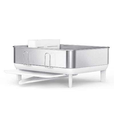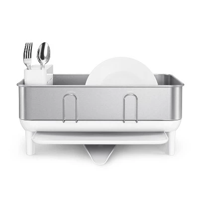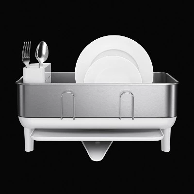 This compact steel frame dishrack has a solid stainless steel frame that is space-efficient, but still has the capacity to handle full-size plates. It has a swivel spout that pivots so you can drain water directly into the sink, and it also can be removed for easy cleaning. An anti-residue coating prevents residue buildup and water spots. Silicone-capped wire rack holds dishes tightly without scratching or chipping. Anti-slip rubber feet keep the dishrack in place on the countertop. A fingerprint-proof coating helps protect against smudges.