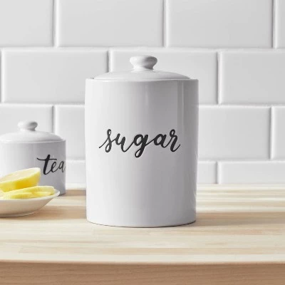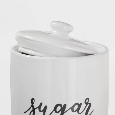 Store sugar in practical style using this Sugar Food Storage Canister from Thresholdâ„¢. Made with stoneware in a glazed finish, the food storage canister comes in a cylindrical shape and features black lettering reading “Sugar” on the front that pops against the white background to make it easy to find among other canisters in your pantry. The stoneware canister comes with a lid to help keep the food contained and covered. This white food storage canister looks great on your countertop or tucked away in your pantry.