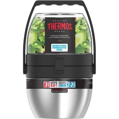 The Thermos Dual Compartment Food Jar is the latest, most innovative reusable food storage container on the market! With two separate hinged compartments, this food jar makes for endless combinations of mealtime enjoyment. Store hot soup in the 16 oz. stainless steel compartment and a cool salad in the 20 oz. plastic compartment. Vacuum insulation technology keeps contents in the stainless steel compartment hot for up to 5 hours or cold for up to 7 hours. This food jar features an integrated carrying handle for easy transport. Each container has a locking stopper to prevent leaks. The container hinges to open and locks when closed.