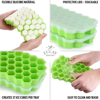 Cracking a standard ice cube tray can prove to be difficult in the long run, especially when it can only make a small amount of ice at a time. With the Zulay Kitchen Honeycomb Ice Tray, you can now create 37 hexagon shaped cubes in one go! Made with BPA Free 100% silicone that is soft and bendable for easy removal. Each cube has a diameter of a quarter designed to perfectly fit into any water bottle. Package includes 2 trays and 2 lids.