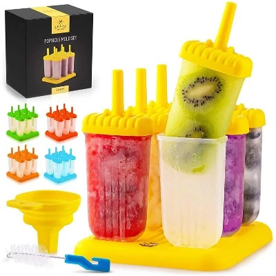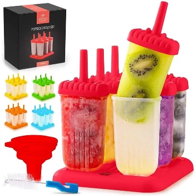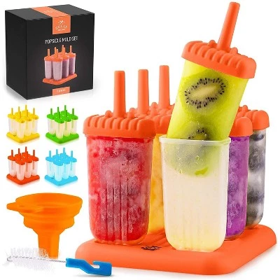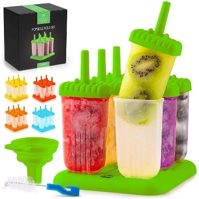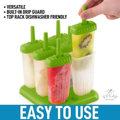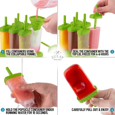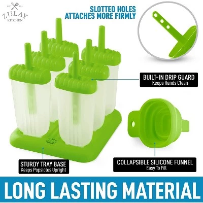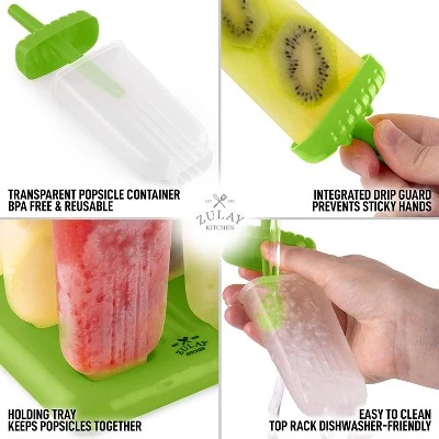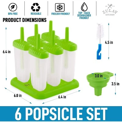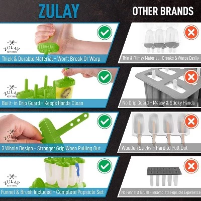 Making popsicles is a fun thing to do together with your family and friends when the ice pops season kicks off. Whip up your own mixture with the Zulay Kitchen Popsicle Molds that are 100% BPA Free and designed to make up to 6 pieces of sweet and icy goodness. Perfect for freezing juice, fruit, yogurt & pudding based ice pops. The stick is designed with slotted holes that hold popsicles together making the removal of your frozen treats quick and effortless. Another good thing is the easy to hold handle, designed with a built-in drip guard that keeps your hands from the sticky mixture when things start to melt. Made with premium quality food-grade material that is durable, thick, and long-lasting. Comes with a collapsible silicone funnel that provides a quick and easy pour minus the mess when transferring your mixture into the popsicle slots. The mold has a dimension of 5.5 x 6 x 6.4 inches. No need to worry about your popsicle breaking or crumbling when trying to get them out of the molds just run a little warm water over the ice pop maker and voila! the popsicle will instantly come right out. Can be cleaned by hand washing or popped in your dishwasher for a thorough cleanse. The package also comes with a cleaning brush.Long Lasting Material – Slotted Holes Attaches More Firmly, Built-In Drip Guard Keeps Hands Clean, Collapsible Silicone Funnel Easy To Fill, Sturdy Tray Base Keeps Popsicles Upright. 6 Popsicle Set – Product Dimensions (6.4inx6.0inx6.4in, Brush: 4.5in, Funnel: 3.0inx3.5in), BPA Free, Reusable, Freezer Friendly, Top – Rack Dishwasher Friendly. Transparent Popsicle Container BPA Free & Reusable, Integrated Drip Guard Prevents Sticky Hands, Holding Tray Keeps Popsicles Together, Easy To Clean Top Rack Dishwasher-Friendly. Fill Containers Using The Collapsible Funnel, Seal The Container With The Top Lid Freeze For 4-6 Hours, Hold The Popsicle Container Under Running Water For 15 Seconds, Carefully Pull Out & Enjoy. Easy To Use – Versatile, Built-In Drip Guard, Top Rack Dishwasher Friendly. Zulay – Thich & Durable Material – Won’t Break Or Wrap, Built-In Drip Guard – Keeps Hands Clean, 3 Whole Design – Stronger Grip When Pulling Out, Funnel & Brush Included – Complete Popsicle Set. Other Brands – Thin & Flimsy Material – Breaks & Warps Easily, No Drip Guard – Messy & Sticky Hands, Wooden Sticks – Hard To Pull Out, No Funnel & Brush – Incomplete Popsicle Experience.