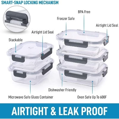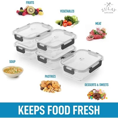 5 pack storage containers, replace your old and flimsy plastic containers with the Zulay Kitchen Glass Storage Containers. Made from high-quality borosilicate glass that is sturdy, durable, and aesthetically pleasing. Premium borosilicate glass; featuring a 100% BPA free thick glass that can withstand heat up to 600 degrees Fahrenheit making this glass container best for microwave, oven and freezer. Package comes with 5 rectangular container pieces with 36oz capacity that is perfect for packing work lunch portions, storing leftovers, and neatly prepped meal servings. Note: Lids and silicone rings need to be removed when heating food in the microwave or oven.Keeps your food wonderfully fresh; designed with a removable silicone ring that provides an airtight seal that is 100% leak-proof perfect for storing soup or saucy textured food. The snap-locking lid latches nicely courtesy of its smart flap-rotating hinge design, and eliminates any stress point that could cause damage from being bent too many times.Easy to clean and store; to keep the product in a top-notch condition, we recommend cleaning the lids through hand wash whilst the glass container can be cleaned in the dishwasher on either top or bottom rack. The container lids are stackable with little risk of slipping and perfect for storing in cabinets or fridge as it doesnβt take up too much space. Dimensions: 8.2 x 6.2 x 2.7 inches.No hassle, kitchen happiness Zulay guarantee; We love and take pride in our Glass Storage Containers with Lids (5 pack) and we back this up with a lifetime guarantee. Have the confidence that this product will last. If there are ever any issues, just contact us and we will make it right. Order now and be assured that this product will live up to your expectations, guaranteed. If it does not, we got you covered. Chances are, you will never need to reach out!